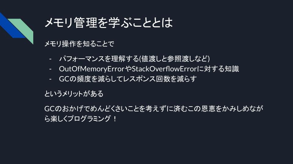 GCがあるおかげでメモリ領域を意識せずにコードが書けているんですね。GCに感謝。