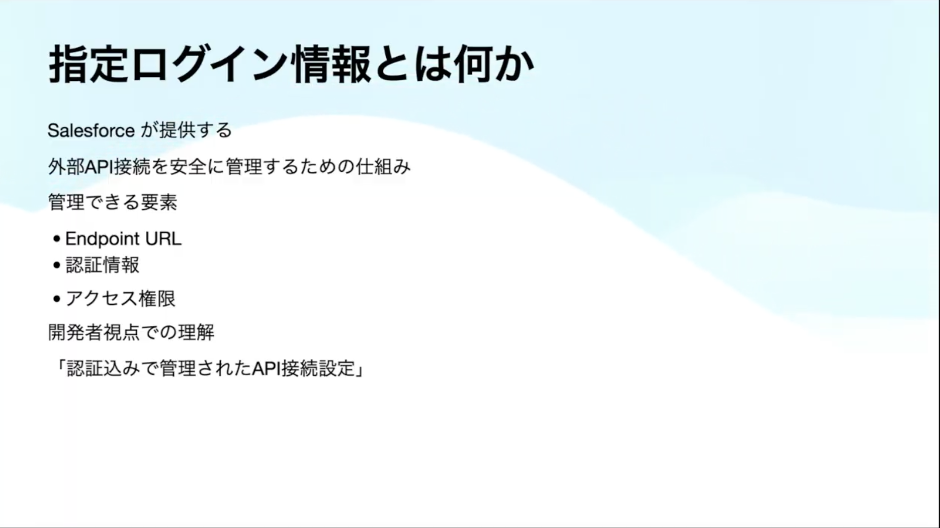 先輩社員のW.Kさんから、Salesforceの指定ログイン情報について詳しく解説していただきました。既存の手法における課題から、指定ログイン情報の特徴やメリット、実際の環境でのデモ、さらにはベストプラクティスまで網羅的な内容でした。