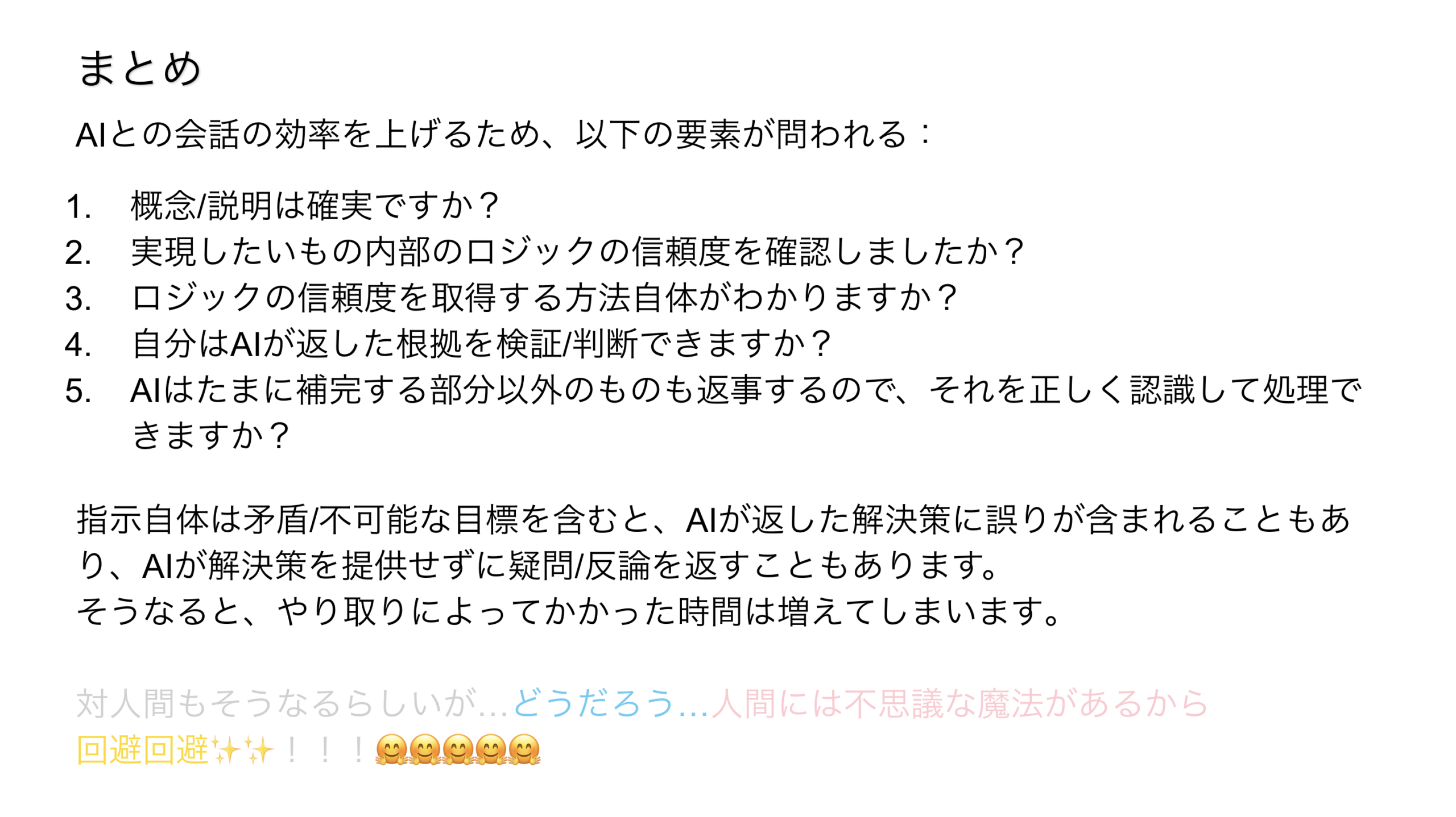 AIとのやり取りで試行錯誤のコストを下げるには、まず問題を小さく分解することが重要です。関連する概念を特定し、信頼度の高い経路を選択すること、そして論理的な正当性は現実世界の事例やコードといった下層原理に基づいて判断すべきである、と説明されました。また、AIが誤った応答を繰り返す「局所最適解」に陥った際は、迷わず新しい会話を開始してリセットするという具体的な対処法も非常に参考になりました。